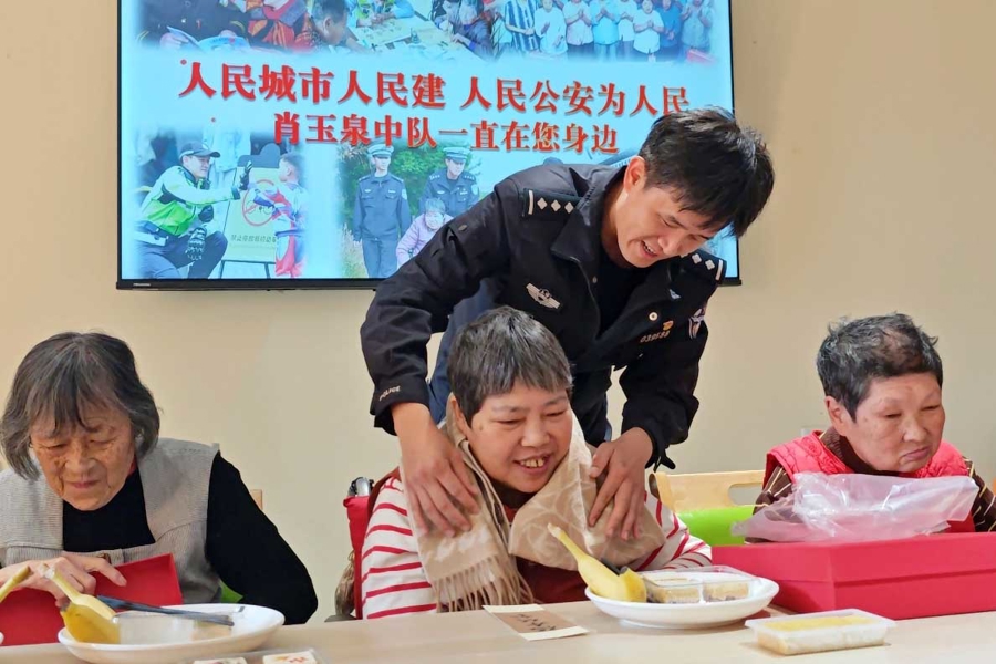 秋意渐浓,空气中带着些许寒意。赶在重阳节到来之前,10月28日上午,上海市公安局杨浦分局交管支队机动大队副大队长、“肖玉泉中队”带头人倪嘉辉结束早高峰执勤后,趁工休间隙,带着韩悦、蔚彦峰等青年队员又一次走进人和养老院,为老人们送上重阳节的节日祝福。